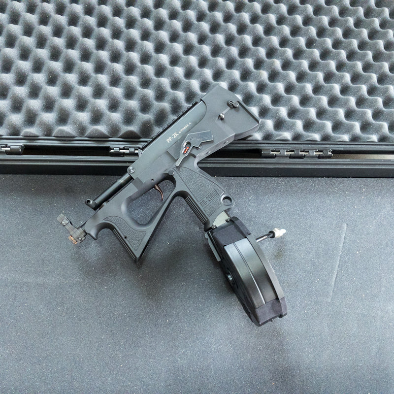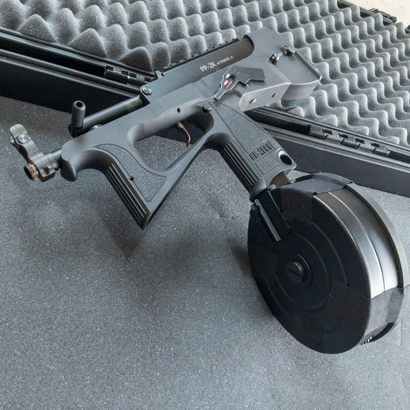 2000 round drum is steel with a custom carbon fiber rear cover, and matches the Eastern European aesthetic of the PP2K instead of just slapping a 5.56 drum on it. 😉